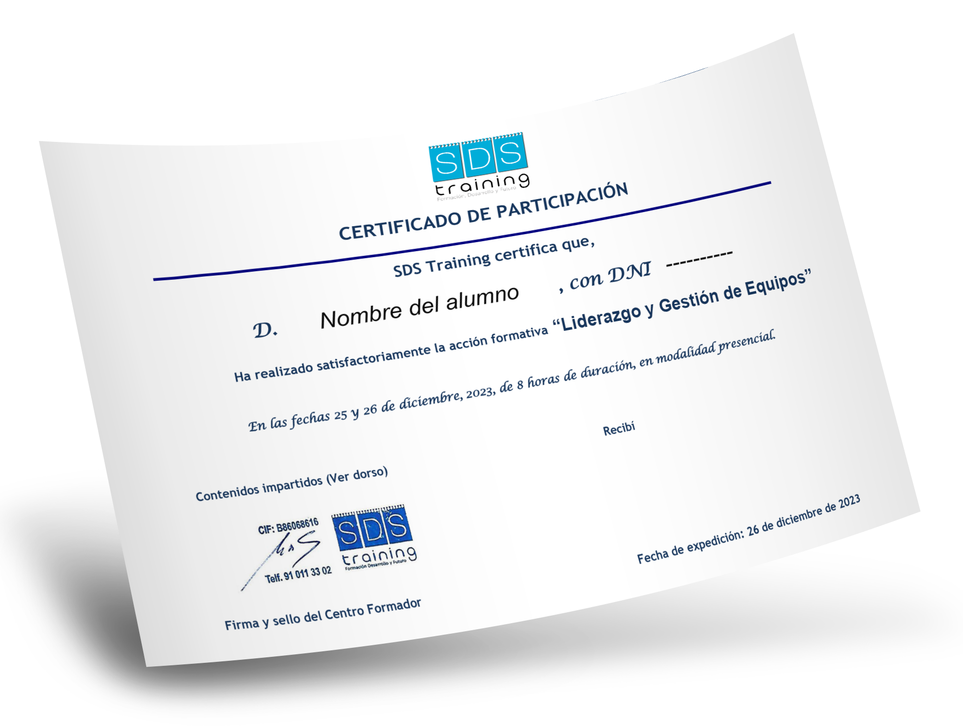 Al finalizar la formación entregaremos un diploma acreditativo a cada participante en el que se recogen los contenidos impartidos, la duración de la formación y las fechas de impartición.